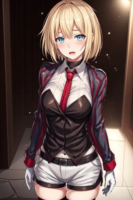 ahoge, bangs, blonde hair, blue eyes, blush, tie, eyebrows visible through hair, gloves, jacket, long sleeves, looking at viewer, open clothes, open mouth, shirt, short hair, shorts, solo, standing, white gloves, white shorts, red tie, flat breasts;
