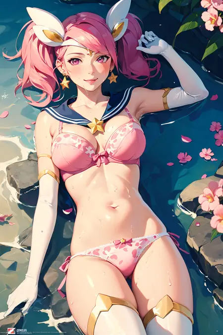 标签:白色过膝袜、starguardianlux、肘部手套、发饰、王冠、短裙、星之守护者\(英雄联盟\),心形瞳孔、粉发、双马尾、短发