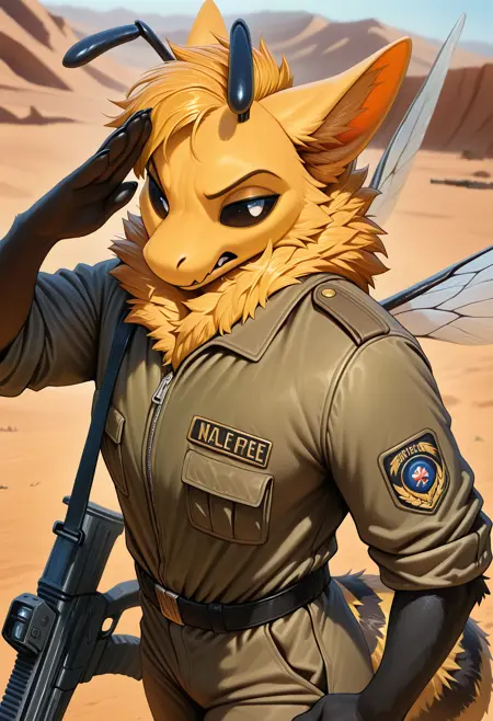 // Illustrious: sunb3e, male, solo, 1boy, adult, male focus, wings, colored sclera, looking at viewer, insect wings, yellow body, fluffy tail, nostrils, clothed, clothes, bottomless, partially clothed, black unzip jacket