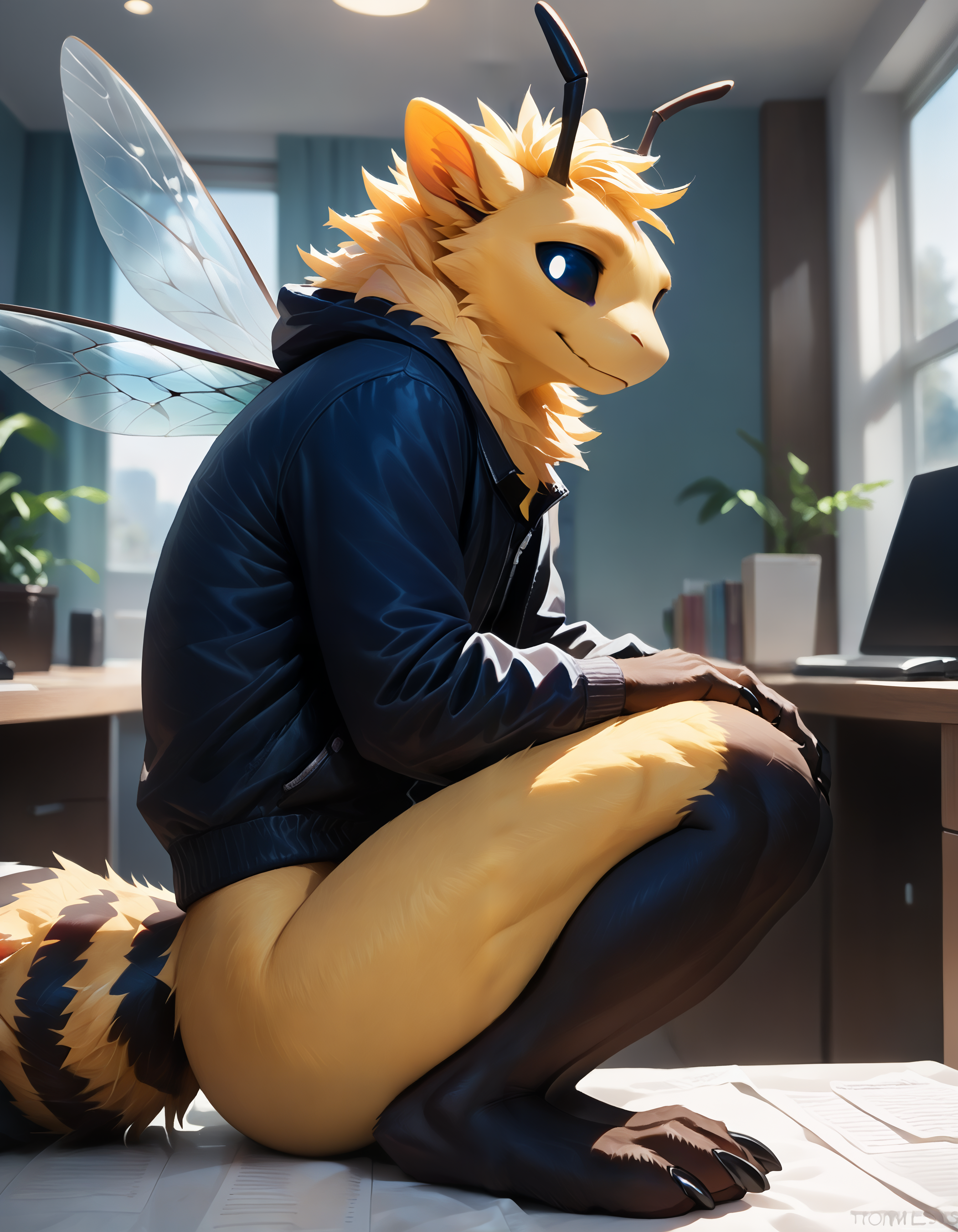 // Illustrious: sunb3e, male, solo, 1boy, adult, male focus, wings, colored sclera, looking at viewer, insect wings, yellow body, fluffy tail, nostrils, clothed, clothes, bottomless, partially clothed, black unzip jacket