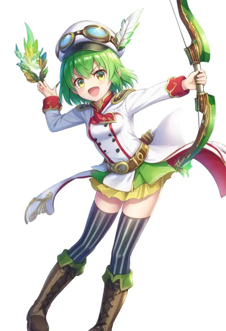 white clothes,white hat,black skirt,red bow,goggles on hat,weather on hat,black thighhights,black button,white mantle,red vertical line white clothes,white cape