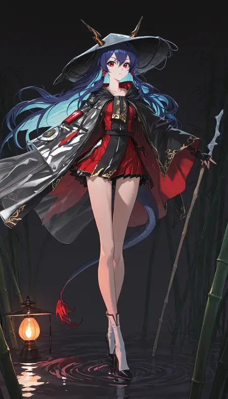 red eyes, dragon horns, blue hair , conical_hat,dragon tail ,