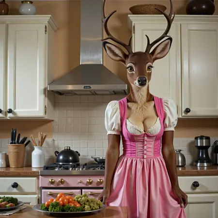 在提示词中使用 c3rv1d deer woman (humanoid c3rv1d deer woman for V2**)**。但有时仅靠这个触发词不足以获得理想效果,Flux模型仍具有强烈的人类偏见,明确描述鹿的特征会有帮助。