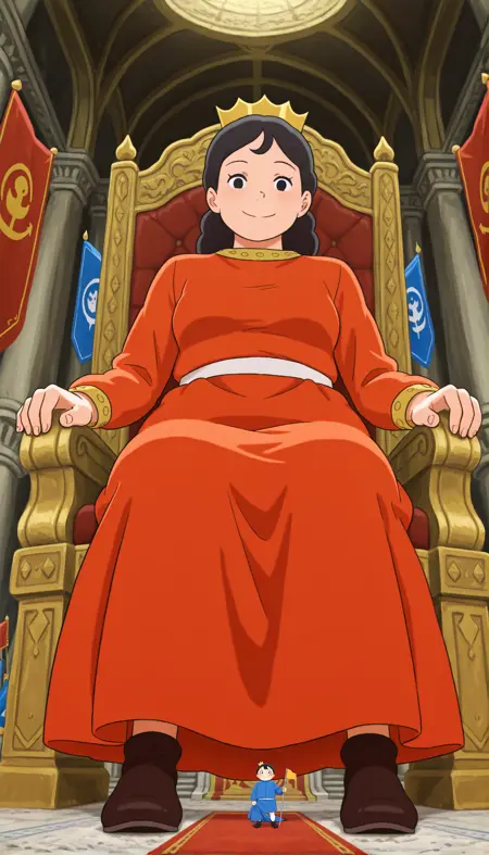 Seena red, 1girl, solo, 王冠, 黑发, 黑眼, 黑色鞋履, 长袖, 红色长裙配白色腰带, (若出现腰带扣,请将“belt buckle”加入负面提示词列表)