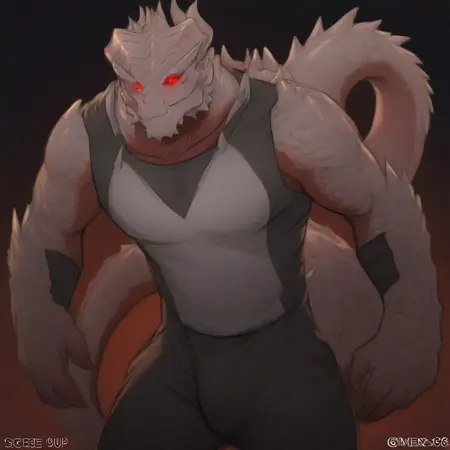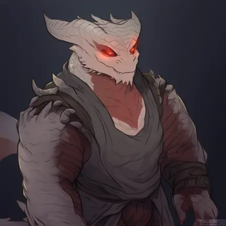 dark urge, dragonborn, white scales, red sclera, red eyes, horns, dragon tail, muscular build, beefy, sharp claws, sharp teeth, slit pupils, detailed scales,