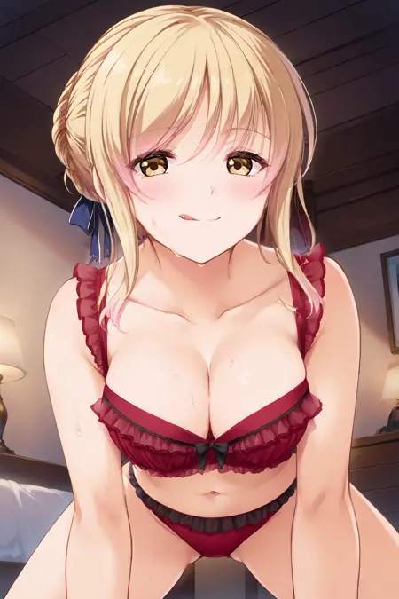 YoukoLingerie, red bra, red panties, frilled_bra, frilled_panties, bow,