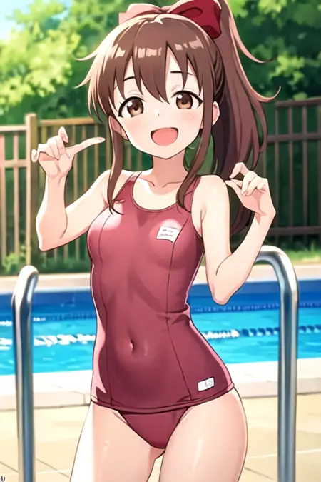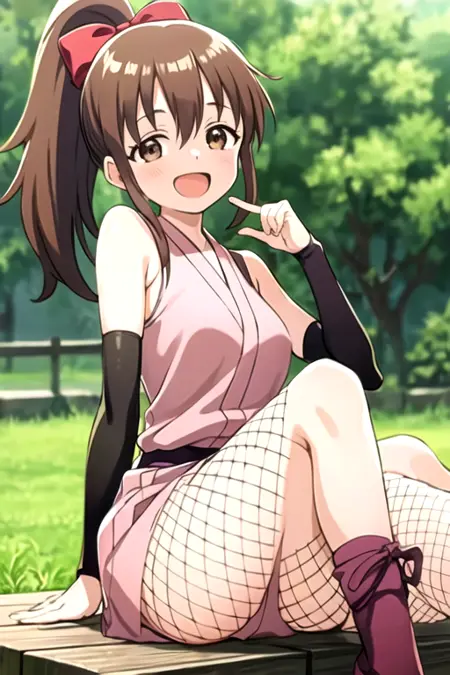 kunoichi_hinagiku, brown eyes, brown hair, ponytail, red bow, sleeveless, japanese clothes, fishnets, smile, open mouth