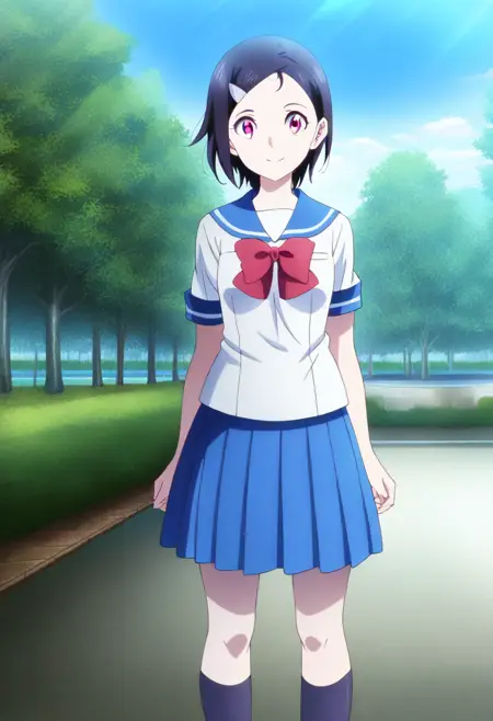 aqua hair and forehead jewel obviously go with her bodysuit outfit while black hair goes with her blue shirt. You can use either/or but given how LoRA's work anything you prompt for will probably be influenced by your choice