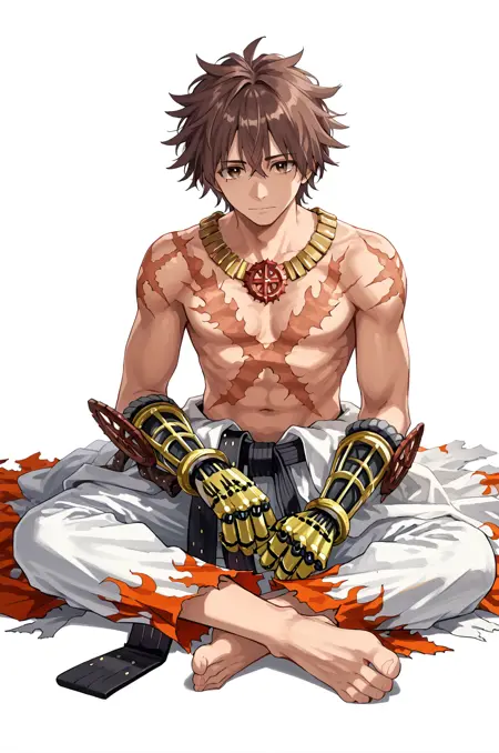 프롬프트: shuraRo, 상의 벗음, 보석, 찢어진 옷, 맨발, 목걸이, 기계식 팔, 검은 벨트, 허리에 감긴 옷, 챔피언십 벨트, 불꽃 무늬, 흰 바지