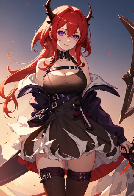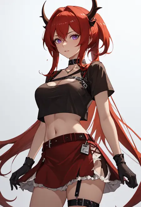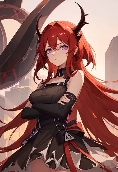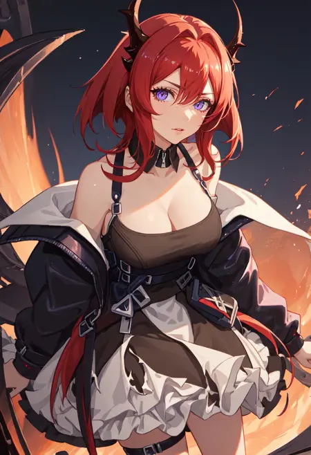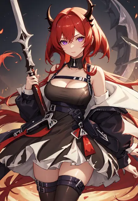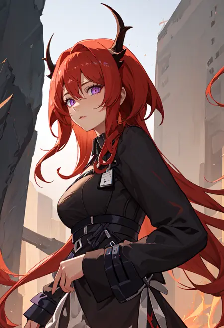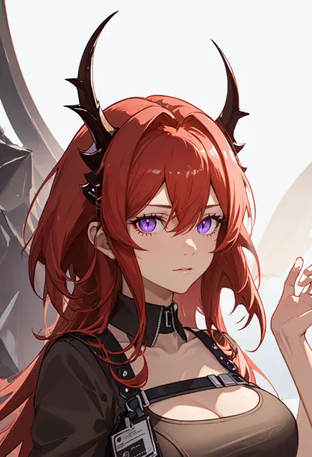 触发词为 surtr_arknights,精简标签为 red_hair, horns, long_hair, purple_eyes, breasts, very_long_hair, hair_between_eyes, demon_horns, medium_breasts。当某些特征(如发色)不稳定时,您可将这些标签添加至提示词中。