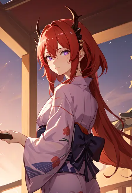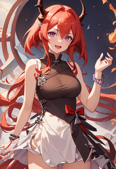 red hair, horns, long hair, purple eyes, breasts, very long hair, hair between eyes, demon horns, medium breasts。当角色的某些特征(例如发色)不稳定时,您可以将这些标签添加到提示词中。 - 图片是使用一些固定提示词和基于数据集的聚类提示词生成的,使用了随机种子,排除了人为挑选。您所看到的就是您能获得的。