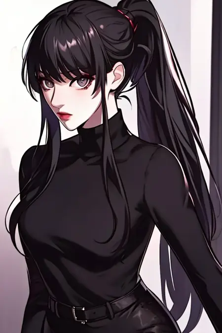 outfit1, ponytail, long sleeves, pantyhose, black sweater, turtleneck, black pants, belt, black jacket,