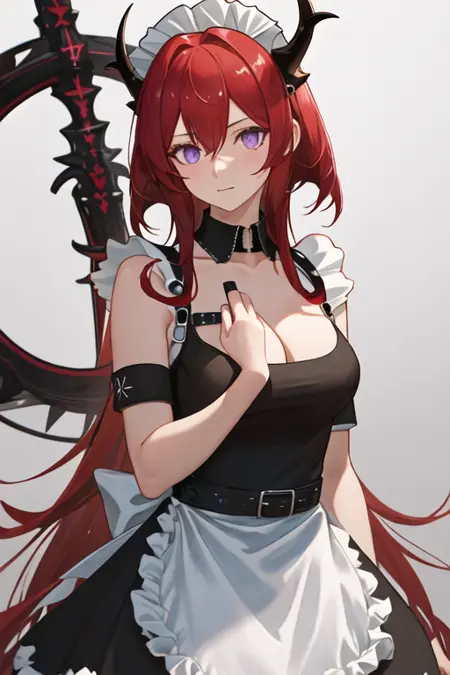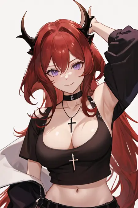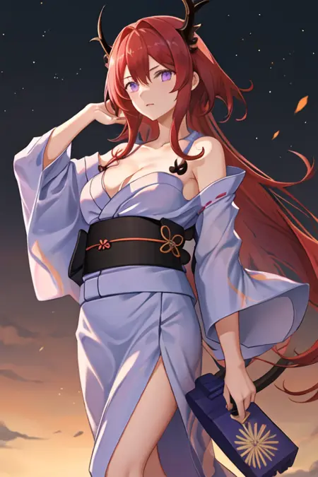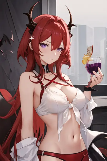 red hair, horns, long hair, purple eyes, breasts, very long hair, hair between eyes, demon horns, medium breasts. You can add them to the prompt when some features of waifu (e.g. hair color) are not stable. - Images were generated using some fixed prompts and dataset-based clustered prompts. Random seeds were used, ruling out cherry-picking. What you see here is what you can get.