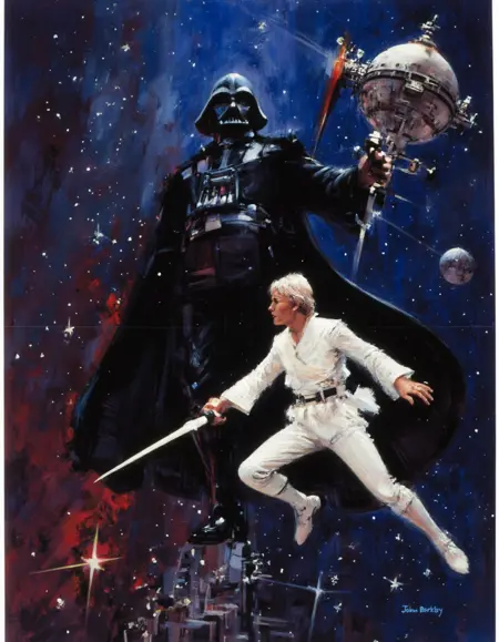 • 以john-berkley风格创作的科幻画作:一名金发男子和一名女子身着飘逸的白色长袍,蹲伏在深蓝与鲜艳红色交织的背景前,身后矗立着高大的黑暗装甲身影——达斯·维达,手持发光的光剑,远处星辰闪烁,一颗神秘的纹理球体悬浮于上方,投射出宇宙般的光辉