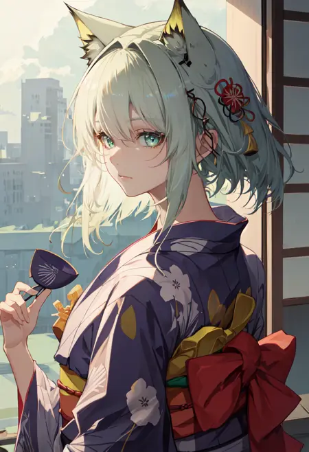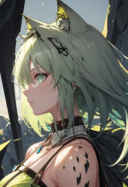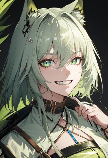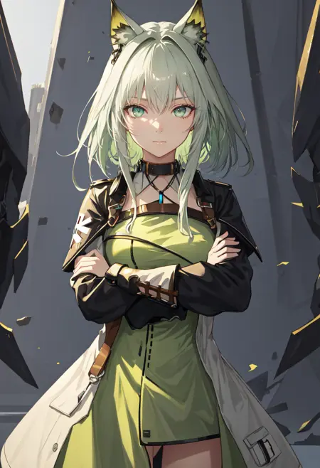 触发词为 kal_tsit_arknights,精简标签为 animal_ears, cat_ears, green_eyes, animal_ear_fluff, short_hair, breasts, grey_hair, white_hair, green_hair当某些特征(如发色)有时不够稳定时,您可将这些标签添加至提示词中