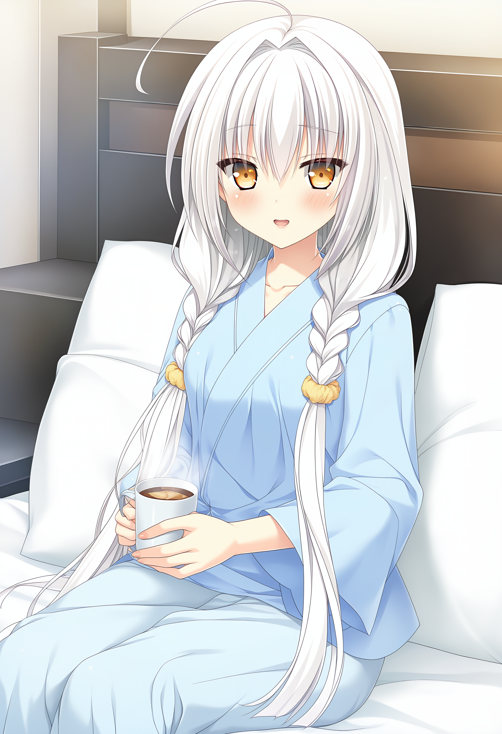 - Hakua5,white hair,yellow eyes,1girl,twin braids,very long braid,hair bobbles,pink and purple bobbles,