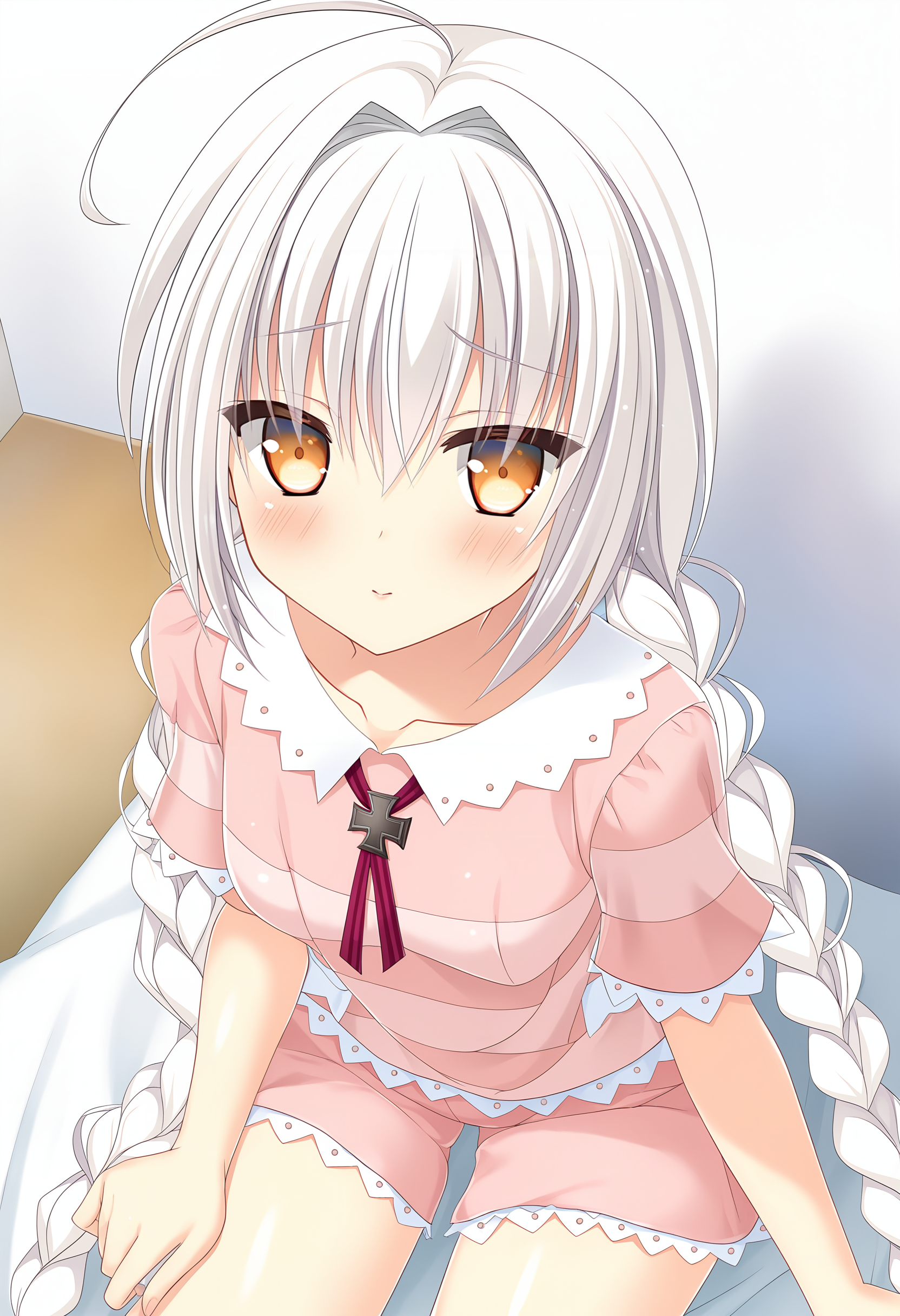 SHUIYI,hakua,1girl,solo,twin braids,low twintails,red neck ribbon,iron cross,pink striped pajamas,white frilled pajamas,white frilled sleeves,pink striped sleeves,pink shorts,white frilled shorts,