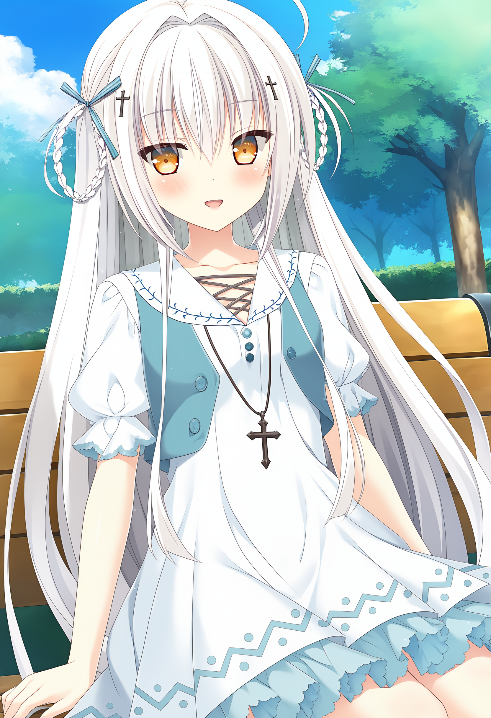 CHANGFU,blue hair ribbon,blue ribbon,white dress,cross necklace,vest,white back bow,frills,