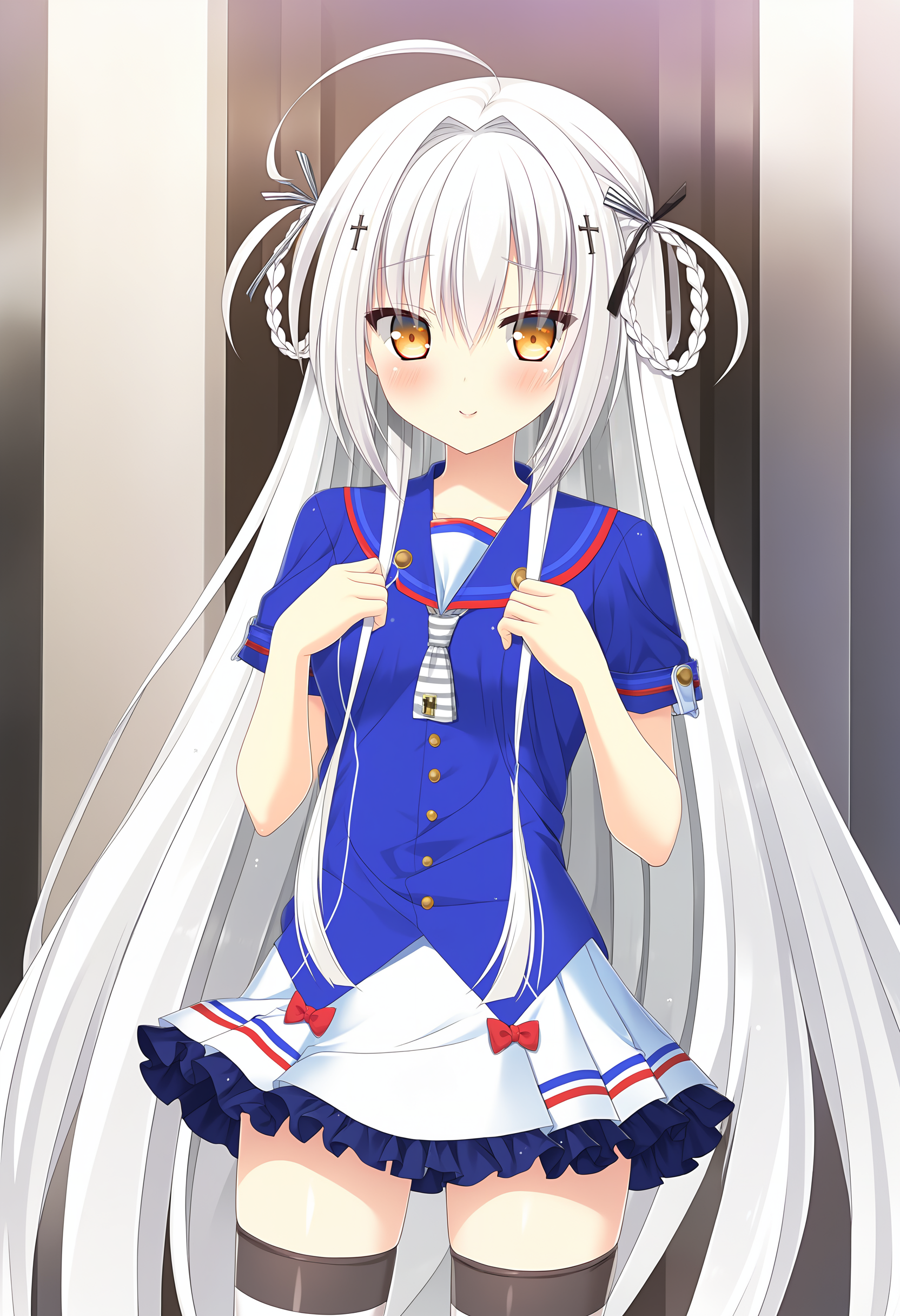 XIAOFU,hakua,1girl,solo,very long hair,braided hair rings,sidelocks,cross hair ornament,hair black ribbon,hair white and black striped ribbon,(blue shirt:1.5),blue jacket,striped necktie,blue short sleeves,blue sailor collar,skirt red bow,white skirt,blue frilled skirt,white and black striped thighhighs,