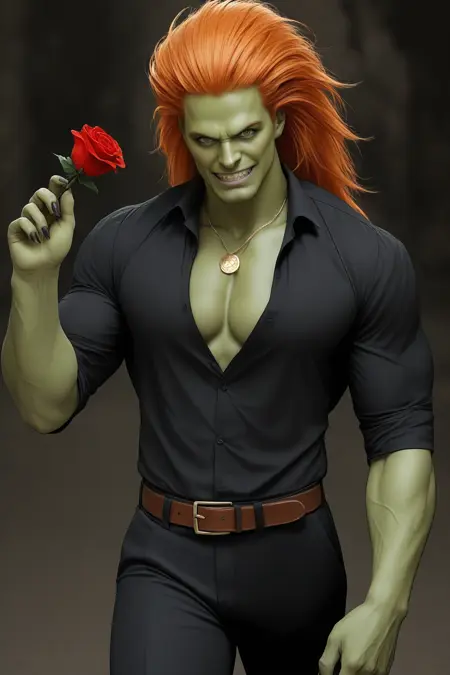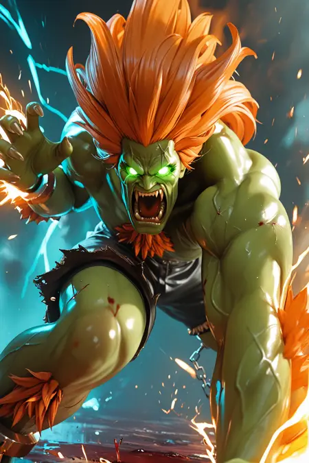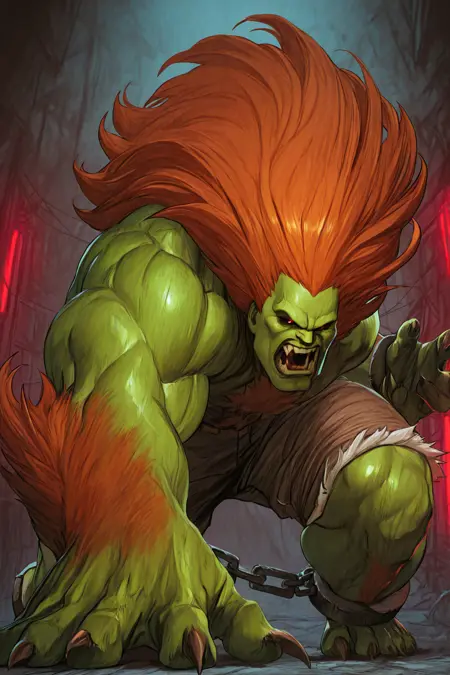 触发词:blnka,长发,有色皮肤,绿色皮肤,怪物男孩,爪子,毛发,短裤,毛边,尖牙,袖口,链条