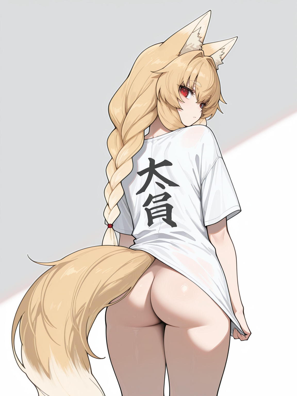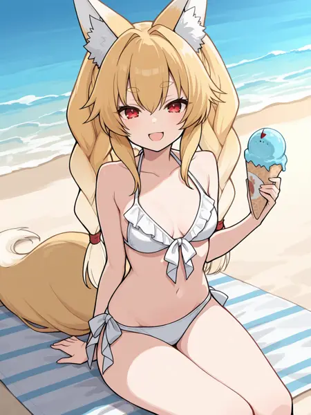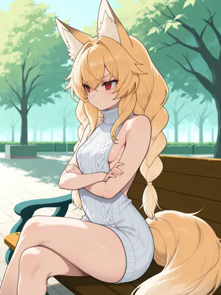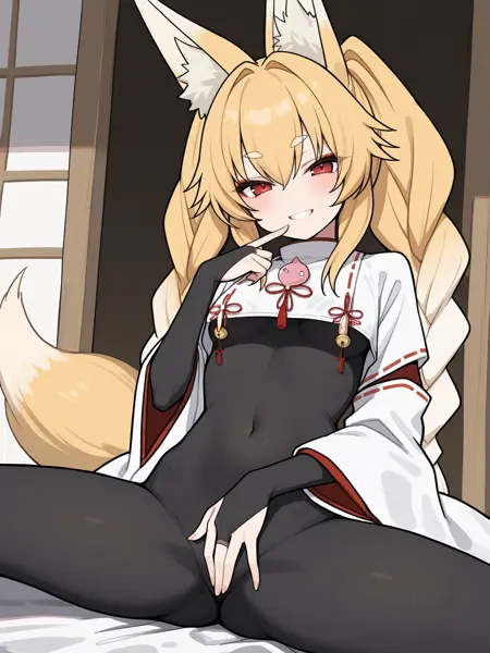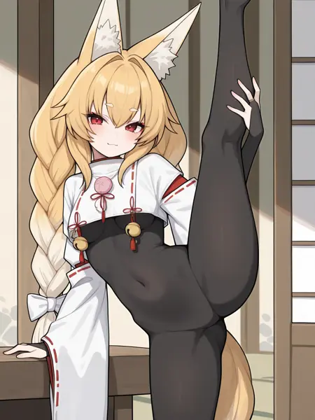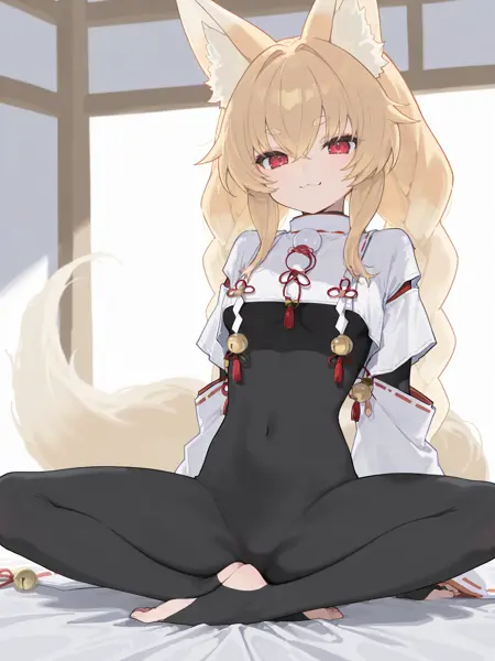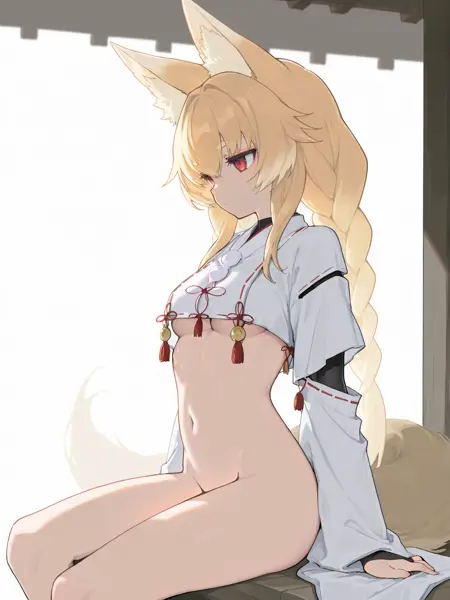 Apperance: ilhokorikei, blonde hair, multicolored hair, long hair, twin braids, red eyes, fox ears, fox tail, sidelocks