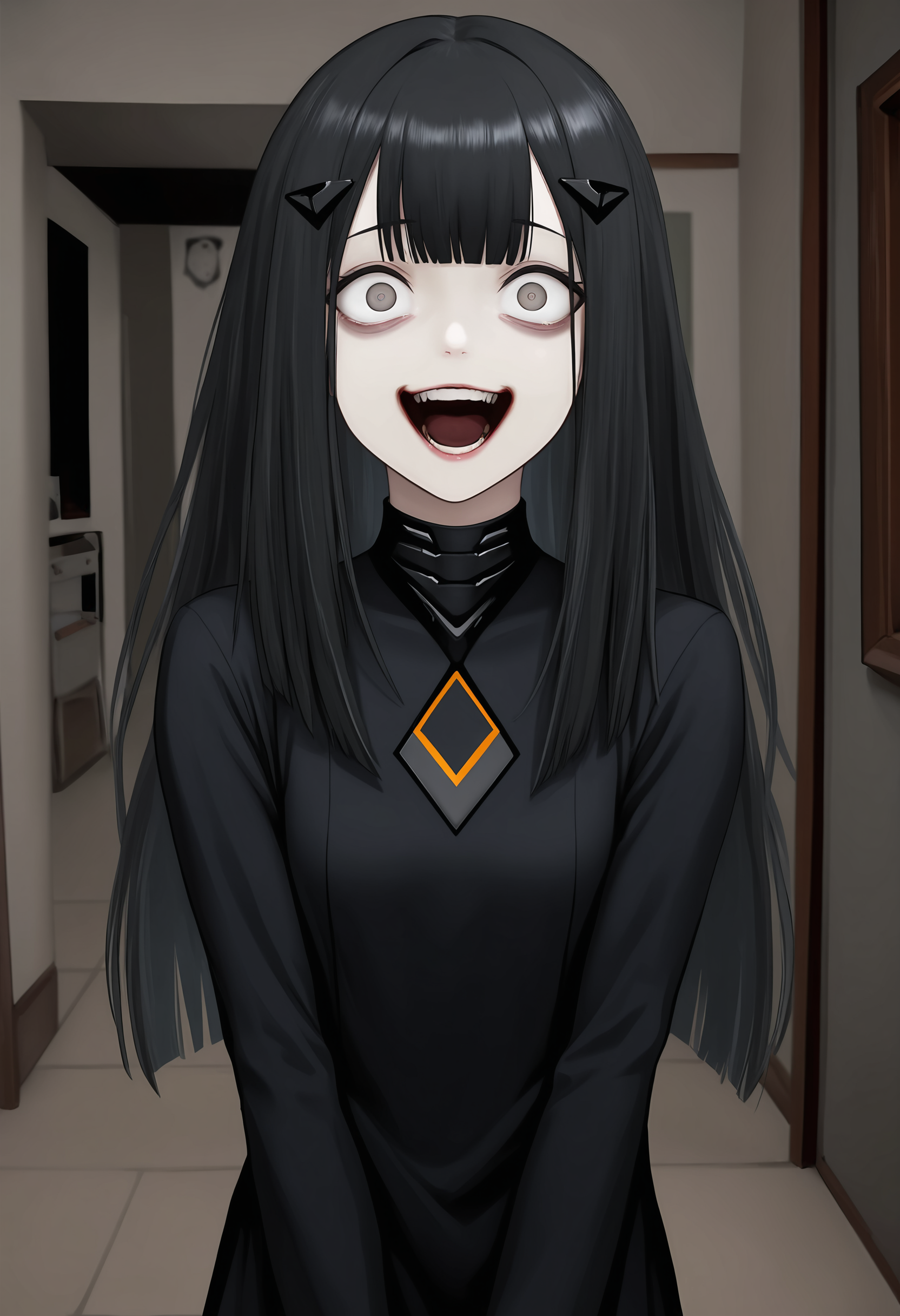 Bonus! How to make Gehenna Girl: 1girl, colored skin, white skin, white hair, side swept hair, long hair, colored sclera, black sclera, yellow eyes, black dress, black lips, black eyeshadow
