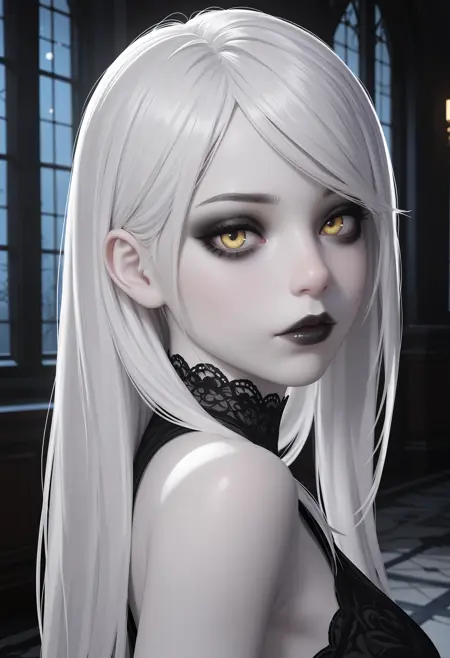 Bonus! How to make Gehenna Girl: 1girl, colored skin, white skin, white hair, side swept hair, long hair, colored sclera, black sclera, yellow eyes, black dress, black lips, black eyeshadow