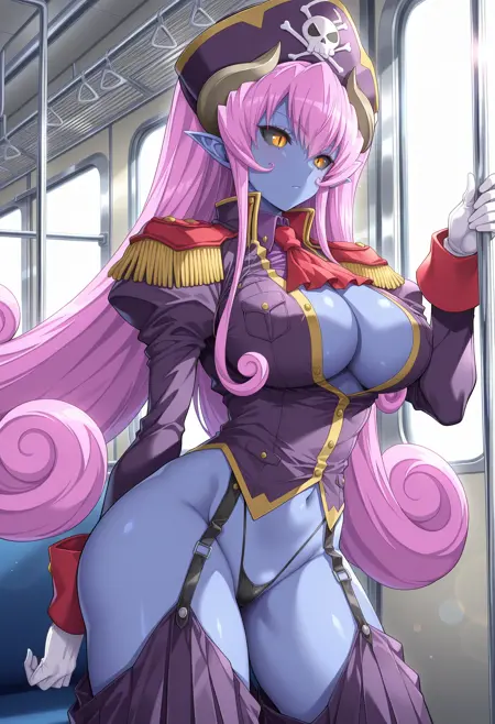 Trigger words: c-efa, blue skin, pink hair, long hair, demon horns, slit pupils, grey sclera, pirate hat,