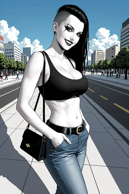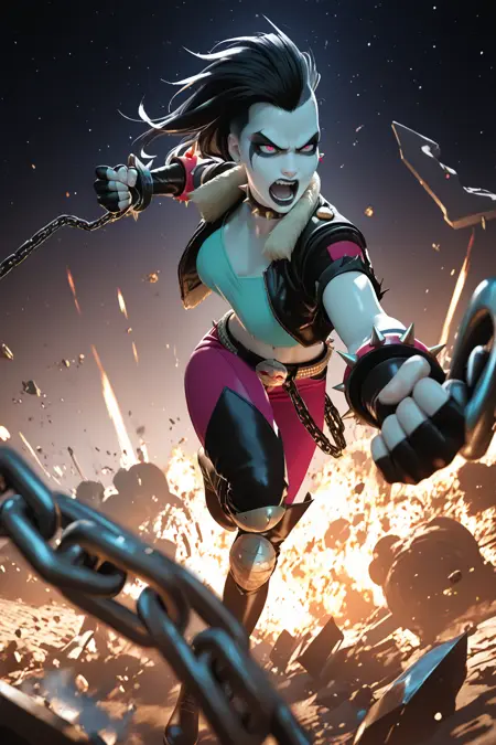 • Trigger : crsh, pale skin, facepaint, long hair, top, cropped jacket, fingerless gloves, fur trim, mohawk, spiked bracelet, studded belt, pants, earrings, midriff, thigh boots, spiked collar, knee pad,