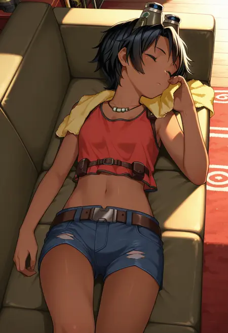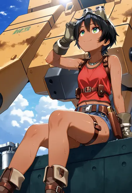 maytacasu, goggles, goggles on head, necklace, red tank top, chest harness, gloves, brown belt, holster, denim shorts, short shorts, brown thigh strap, boots,