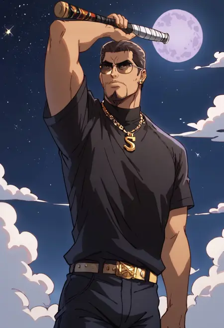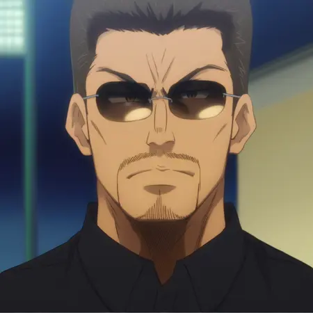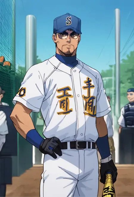 1. ((very cool brown-lens sunglasses, seidou-baseball uniform, seidou-baseball jersey, white baseball shirt with yellow edged blue "青道" logo, blue innerwear shirt, white baseball pants with black belt, blue baseball cap with yellow edged red "S" logo, ))