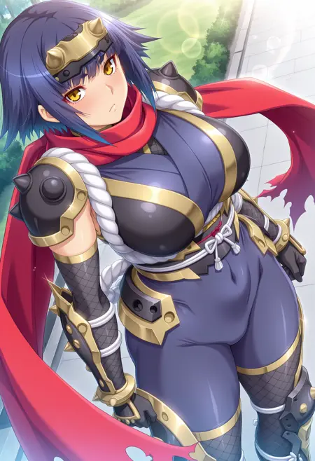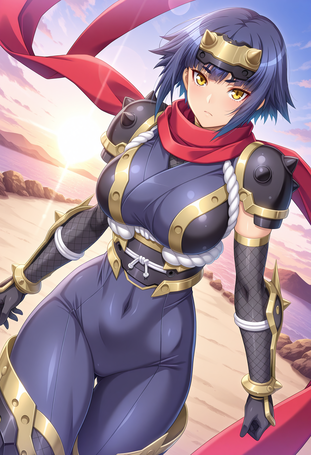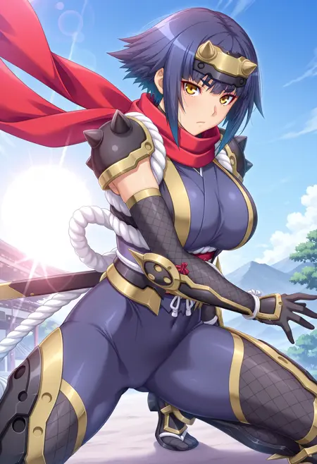 masterpiece, absurdres, newest, 1girl, c-k4guya, blue hair, yellow eyes, short hair, large breasts, forehead protector, red scarf, blue bodysuit, armor, obi, white rope, shoulder armor, fishnets, elbow gloves, vambraces, greaves, dramatic lighting, day, outdoors, lens flare, looking at viewer,