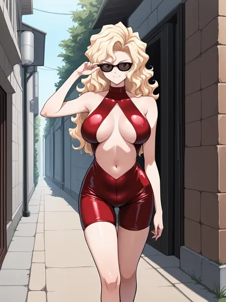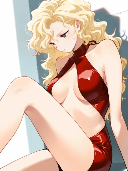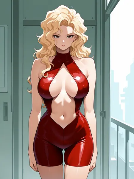 Outfit: red bodysuit, center opening, halterneck, bare legs
