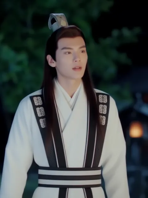 This lifelike video captures Yu Lexuan walking, a young man with long, straight dark hair, wearing traditional Chinese attire. He has fair skin and a calm expression. Yu Lexuan's outfit features a white-colored robe with black, intricate patterns and a white inner layer