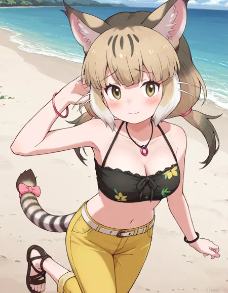 잔글 캣 (케모노 프렌즈), sp_cos, 동물 귀 털, 동물 귀, 고양이 꼬리, 꼬리 리본, 노란 눈, 연한 갈색 머리, 흰색 머리, 다색 머리, 그라디언트 머리, 중간 길이 머리, 낮은 트인테일, 목걸이, 펜던트, 진한 녹색 튜브탑, 꽃 무늬, 어깨 끈, 매듭 옷, 어깨 노출, 팔찌, 노란 바지, 벨트, 끈 신발