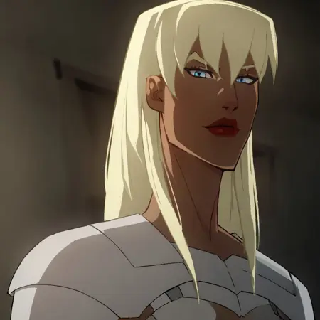 lipstick, blonde hair, long hair, blue eyes, armor, pelvic curtain, Gilotina (dc)
