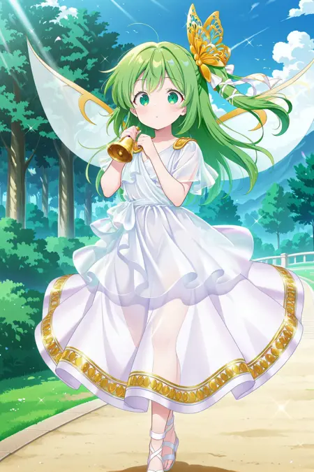 daiyousei, 1girl, solo, green eyes, green hair, long hair, side ponytail, fairy wings, white wings,, daiyousei \(pure white nature\), alternate costume, alternate hairstyle, hair ribbon, white ribbon, butterfly hair ornament, gold hair ornament, gold epaulettes, white dress, gold trims, himation, see-trough himation, ancient greek clothes, greco-roman clothes, white sandals, gladiator sandals, holding handbell,