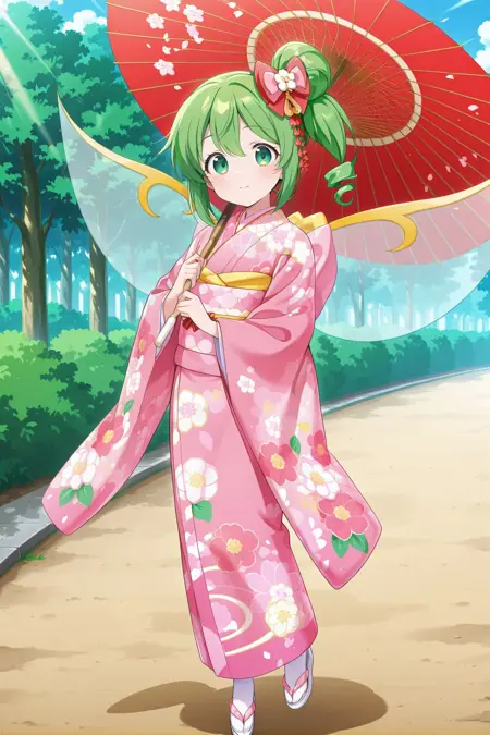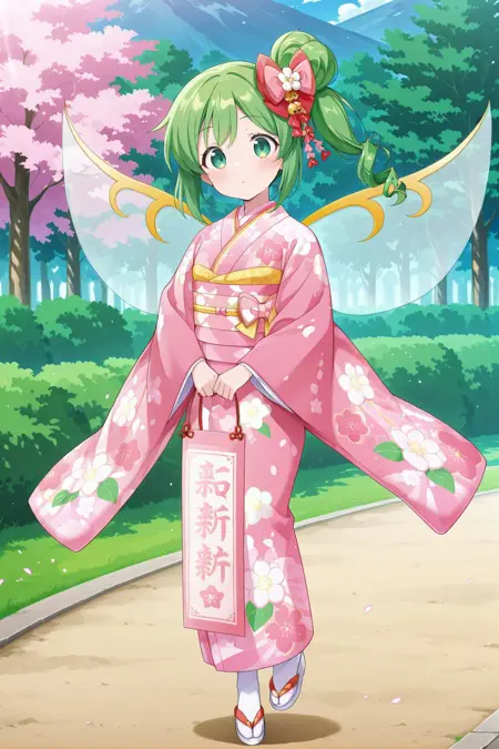 daiyousei, 1girl, solo, green eyes, green hair, long hair, single hair bun, drill ponytail, side ponytail, fairy wings, transparent wings,, daiyousei \(thousand-year candy of longevity\), alternate costume, alternate hairstyle, hair ornament, kanzashi, tsumami kanzashi, hair bow, pink bow, pink kimono, floral print kimono, furisode, long sleeves, wide sleeves, pink obi, yellow obiage, sash, white socks, white sandals, kinchaku, holding pink banner,