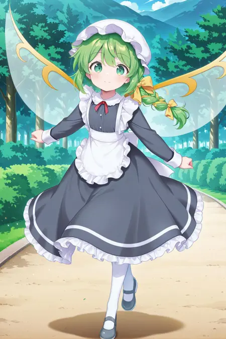 daiyousei, 1girl, solo, green eyes, green hair, long hair, low side ponytail, braided ponytail, fairy wings, transparent wings,, daiyousei \(casual fairy maid\), alternate costume, alternate hairstyle, hair ribbon, yellow ribbon, mob cap, white hat, maid, red neck ribbon, grey dress, long sleeves, frilled dress, frilled apron, white apron, waist apron, back bow, white bow, white pantyhose, mary janes, grey shoes,
