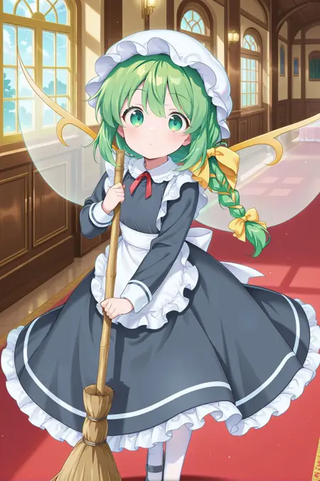 daiyousei, 1girl, solo, green hair, green eyes, hair bow, yellow bow, side ponytail, side braid, fairy wings, daiyousei \(casual fairy maid\), alternate costume, alternate hairstyle, apron, dress, hat, maid, maid apron, mary janes, mob cap, white apron, white hat, blue dress, red ribbon, white pantyhouse,