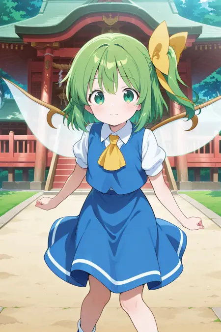 daiyousei, 1girl, solo, green eyes, green hair, medium hair, side ponytail, fairy wings, white wings,, hair ribbon, yellow ribbon, yellow ascot, blue vest, white shirt, collared shirt, short sleeves, blue skirt, white socks, blue shoes,