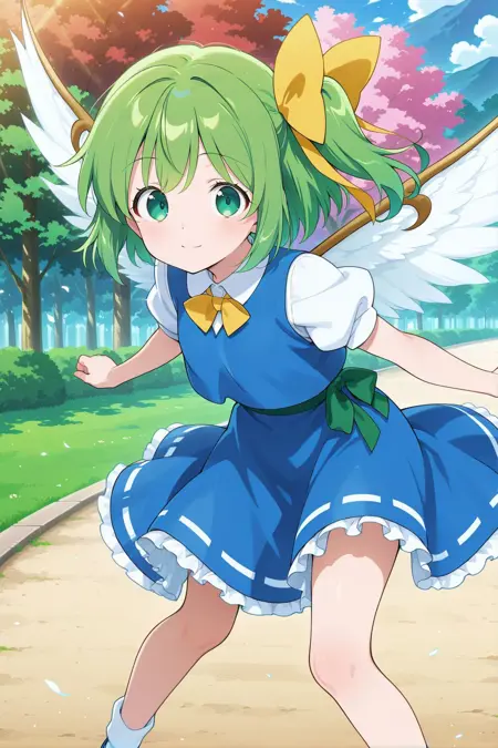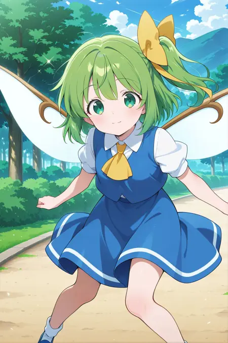 daiyousei, 1girl, solo, green hair, green eyes, hair bow, side ponytail, fairy wings,