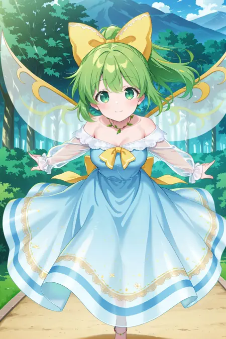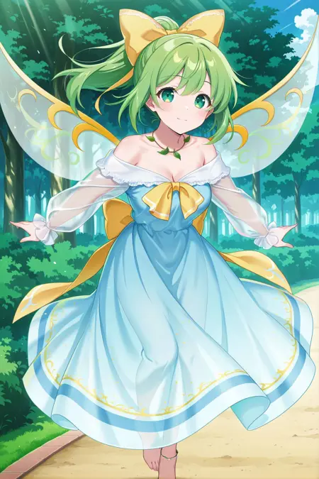 daiyousei, 1girl, solo, green eyes, green hair, long hair, ponytail, fairy wings, transparent wing, medium breasts, aged up,, daiyousei \(ultra-peaceful fairy\), hair bow, yellow bow, leaf necklace, bare shoulders, chest bow, yellow bow, blue dress, gradient dress, long dress, frilled sleeves, see-through sleeves, long sleeves, lace trim, back bow, necklace, anklet, barefoot,
