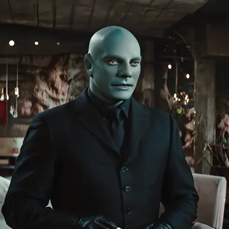 a man sitting confidently on a luxurious armchair, surrounded by a dimly lit opulent room with velvet curtains and gothic architecture, wearing a perfectly tailored black suit, blue skin glowing faintly under soft ambient lighting, piercing gaze, enigmatic and sinister aura