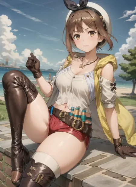 Recommended Prompts: ryza, 1girl, solo, shorts, gloves, belt, hat, head ribbon, jewelry, red shorts, brown hair, thighhighs, short shorts, bridal legwear, necklace, brown eyes, single glove, hair ornament, hairclip, star necklace, toeless footwear, leather, star (symbol), white headwear, brown gloves, boots, short hair, thighs, leather belt, brown belt, leather gloves, jacket, blue belt, navel, thigh boots, sleeveless jacket, thigh pouch, white thighhighs, collarbone, yellow jacket, brown footwear, cleavage, large breasts