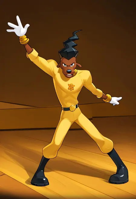 노란 점프수트, 금색 팔찌, 흰 장갑, 검은 부츠, 금색 목걸이, 벨트,