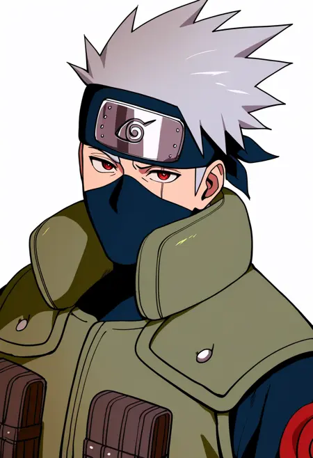 Basic prompts : 1boy, kakashi, grey hair, covered mouth, mouth mask, red eye, scar across eye, forehead protector