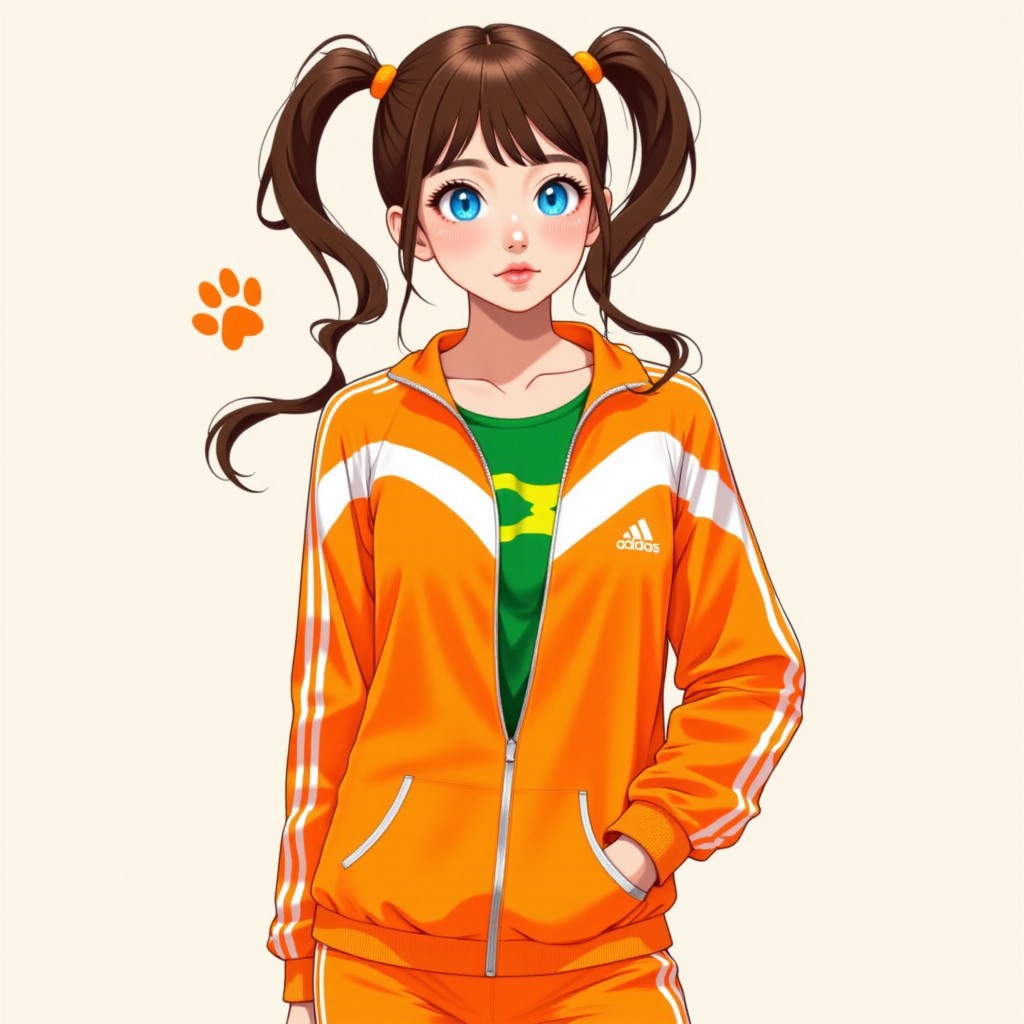 1girl,twintails,brown hair,blue eyes,orange tracksuit,orange jacket,orange pants,green shirt,t-shirt,close jacket