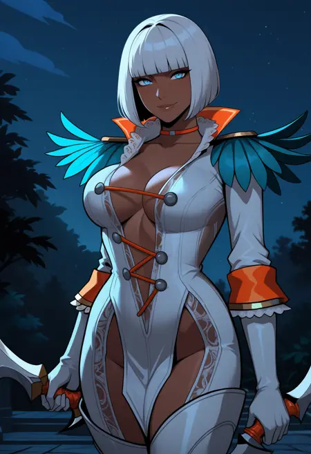 Looks tags: white hair, short hair, bob cut, blunt bangs, blue eyes, dark-skinned female