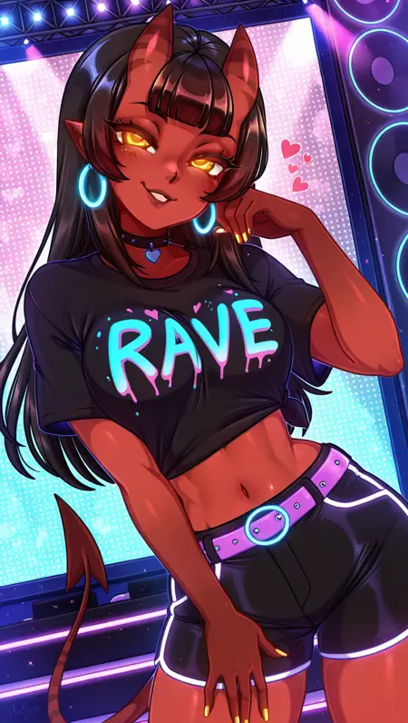 meruccubus, red oni, colored skin, red skin, pointy ears, long hair, mole, oni, blunt bangs, freckles